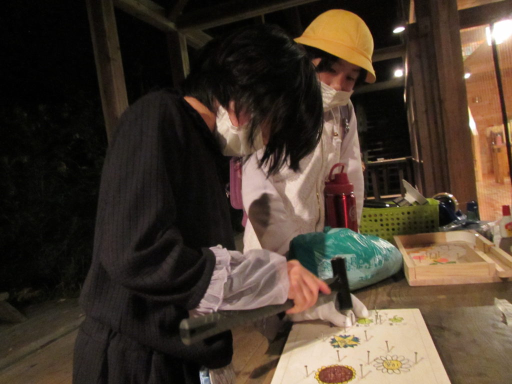 指を打たないように・・・かなづちでくぎをトントントン。